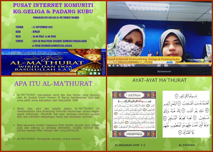 • Program bacaan Al-Maturat ini diadakan secara dalam talian melalui flatform page fb live gabungan Pusat Internet Komuniti Kg.Geliga dan Padang Kubu.